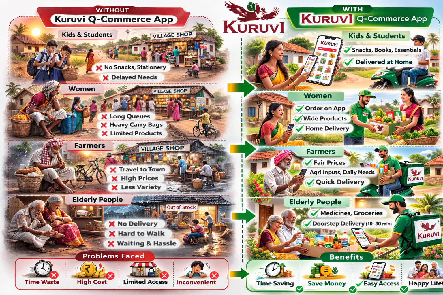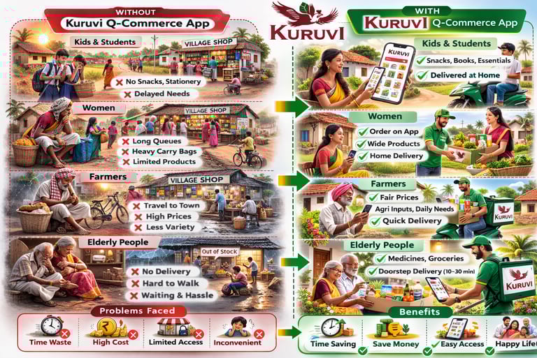Kuruvi is redefining rural commerce with two core products: the Kuruvi app, a fast and simple platform for villagers to order essentials in seconds, and the Kuruvikal app, empowering local youth to deliver within 15–20 minutes.