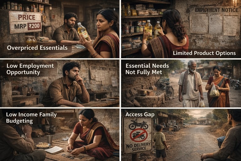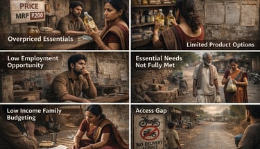 Rural India spends more but gets less. Every month, millions of families pay above MRP for essentials that are inconsistent in quality and supply—spending up to 35% of their income without real value. Local shops frequently run out of stock, forcing villagers to travel miles for basics, while urgent needs like baby food or medicines often go unmet. Rural children grow up without access to essential products or digital tools, limiting exposure and opportunity.